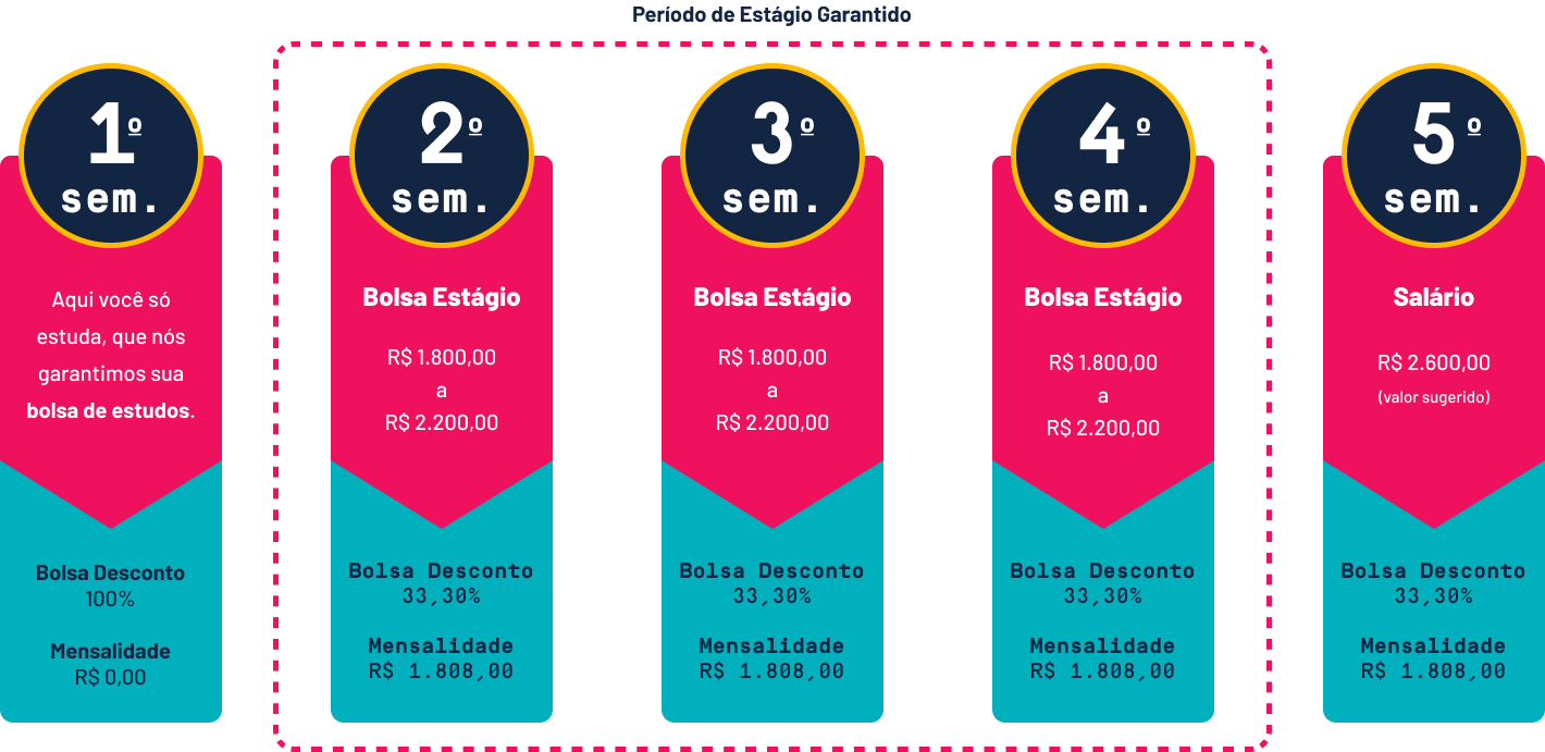 No curso de Análise e Desenvolvimento de Sistemas, com duração de 2 anos e meio, você tem estágio remunerado garantido por 18 meses e bolsa de 100% do valor da mensalidade no primeiro período.