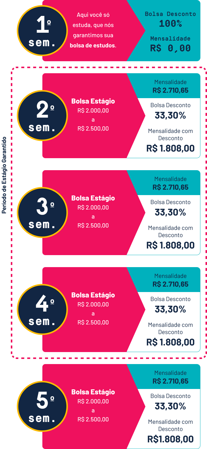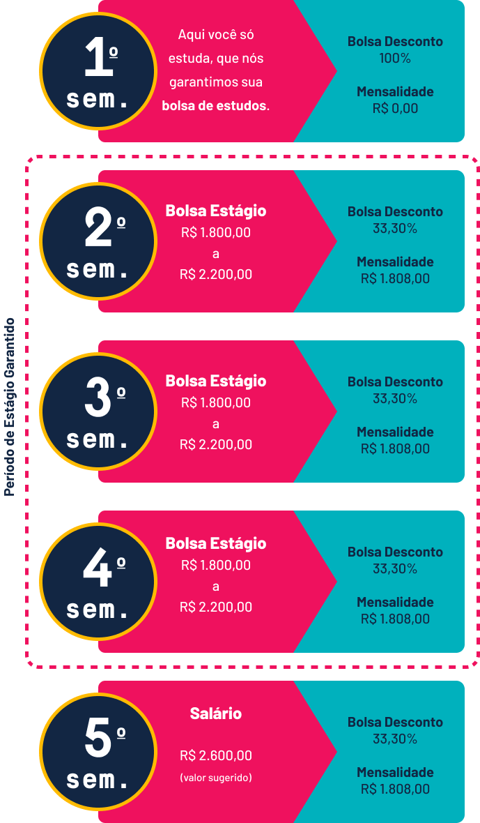 No primeiro ano, você se dedica integralmente aos estudos e a Faculdade garante uma bolsa de 100%. A partir do segundo ano, você já está estagiando em alguma das melhores empresas do Brasil, com um valor de bolsa estágio alinhado ao valor da mensalidade que você paga.